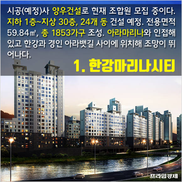 시공(예정)사 양우건설로 현재 조합원 모집 중이다. 지하 1층~지상 30층, 24개 동으로 건설 예정. 전용면적 59.84㎡ 규모로 총 1853가구 조성 예정. 수상레포츠 시설인 아라마리나와 인접했고 한강과 경인 아라뱃길 사이에 위치해 조망이 뛰어나다.