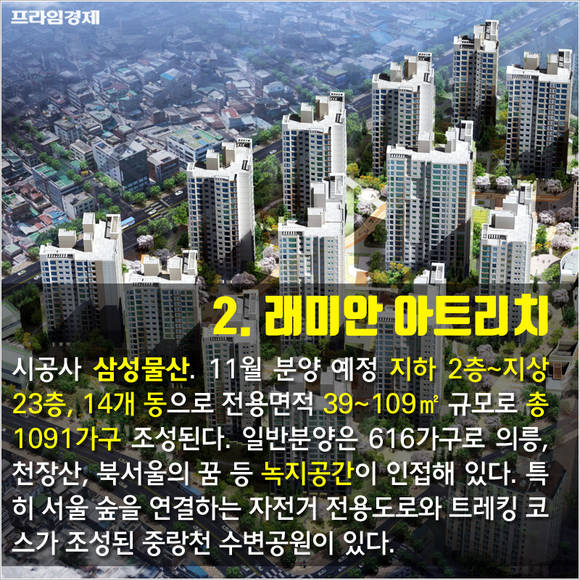 시공사 삼성물산. 11월 분양 예정이며 지하 2층~지상 23층, 14개 동으로 전용면적 39~109㎡ 규모, 총 1091가구가 조성된다. 일반분양 물량은 616가구로 의릉, 천장산, 북서울의 꿈 등 녹지공간이 단지에서 가깝다. 특히 서울 숲을 연결하는 자전거 전용도로와 트레킹 코스가 조성된 중랑천 수변공원이 있다.