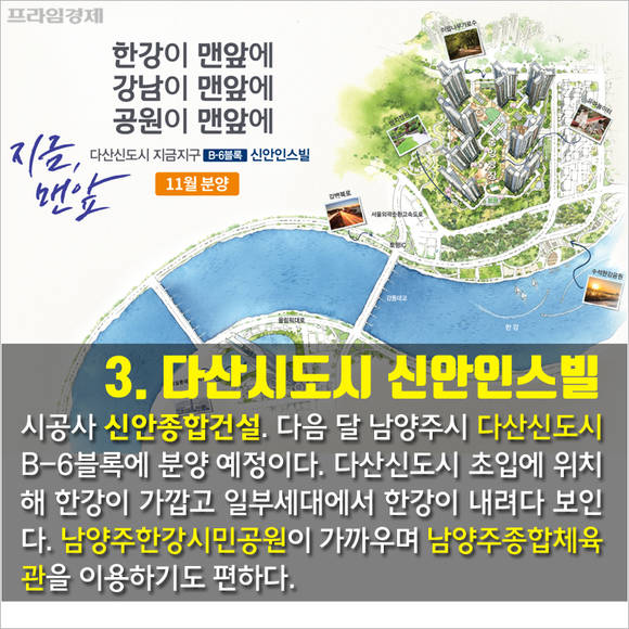 시공사 신안종합건설. 다음 달 남양주시 다산신도시 B-6블록에 분양 예정이다. 다산신도시 초입에 위치해 한강이 가깝고 일부세대에서 한강이 내려다보인다. 남양주한강시민공원이 가까우며 남양주종합체육관을 이용하기도 편하다.