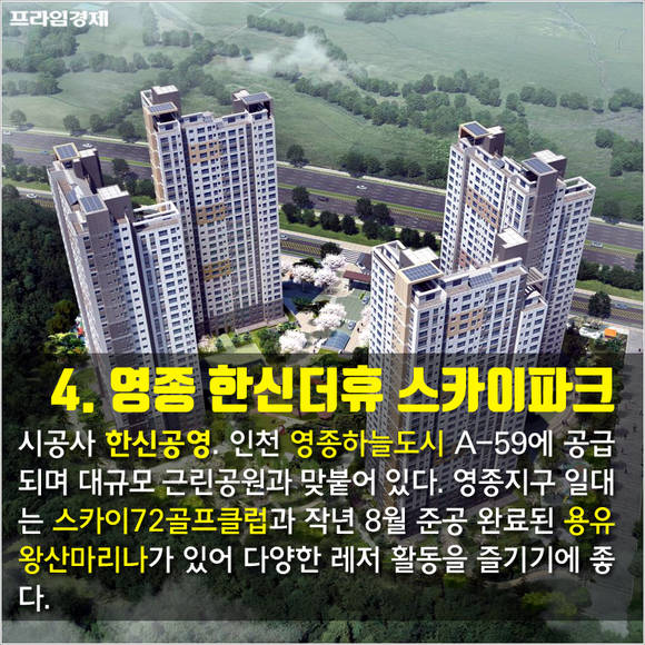 시공사 한신공영. 인천 영종하늘도시 A-59에 공급되며 대규모 근린공원과 맞붙어 있다. 영종지구 일대는 스카이72골프클럽과 작년 8월 준공 완료된 용유 왕산마리나가 있어 다양한 레저 활동을 즐기기에 좋다.