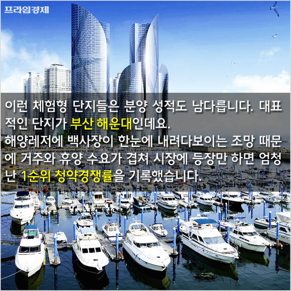 이런 체험형 단지들은 분양 성적에서도 차별화를 이룬다. 대표적인 단지는 부산 해운. 갖가지 해양스포츠를 즐길 수 있는데다 백사장이 한눈에 내려다보이기 때문에 거주 수요와 휴양 수요가 겹치면서 두 자릿수가 넘는 1순위 청약경쟁률을 기록했다.