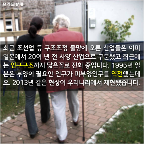 최근 조선업 등 구조조정 물망에 오른 산업들은 이미 일본에서 20여년 전 사양 산업으로 구분됐을 뿐 아니라 최근에는 인구구조까지 닮은 꼴로 진화 중입니다. 1995년 일본은 부양이 필요한 인구가 피부양인구를 역전하는 상황을 맞았는데요. 2013년 같은 현상이 우리나라에서 재현됐습니다.