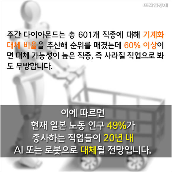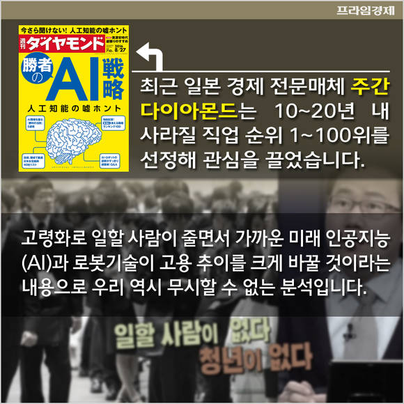 최근 일본 경제 전문매체 주간 다이아몬드는 향후 10~20년 내에 사라질 직업 랭킹을 발표해 눈길을 끌었습니다. 고령화로 노동력 부족 현상이 두드러지면서 가까운 미래 인공지능(AI)과 로봇기술이 일본의 고용 추이를 크게 바꿀 것이라는 내용입니다. 우리로서는 무시할 수 없는 분석입니다.