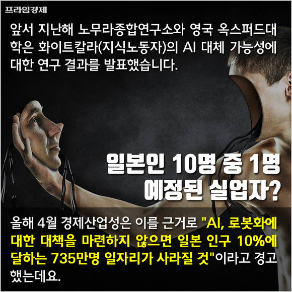 앞서 지난해 노무라종합연구소와 영국 옥스퍼드대학이 화이트칼라(지식노동자)의 AI 대체 가능성을 경고한데 이어 지난 4월 경제산업성은 "AI, 로봇화에 대한 대책을 마련하지 않으면 일본 인구 10%에 해당하는 735만명의 일자리가 사라질 것"이라고 경고한 바 있는데요.