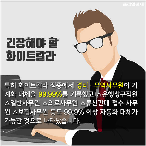 이 결과 특히 화이트칼라 직종에서 경리·무역사무원이 기계화 대체율 99.99%를 기록했고 △은행창구직원 △일반사무원 △의료사무원 △통신판매 접수 사무원 △보험사무원 등도 99.9% 이상 자동화 대체가 가능한 것으로 나타났습니다.