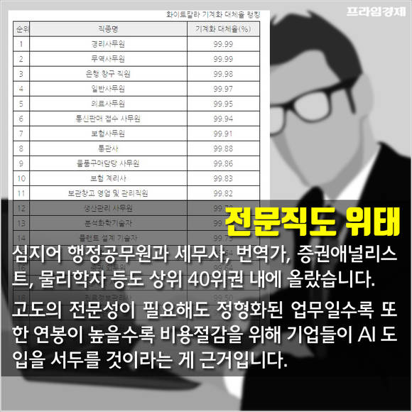 심지어 행정사무원 등 공무원과 전문직인 세무사, 번역가, 증권사 애널리스트, 물리학자 등도 상위 40위권 내에 올라 충격적입니다. 고도의 전문성이 필요하지만 일정한 규칙과 정형화된 업무가 주를 이루고 고액연봉자가 많아 기업이 비용절감을 위해 AI 도입을 서두를 가능성이 크다는 게 이유입니다.