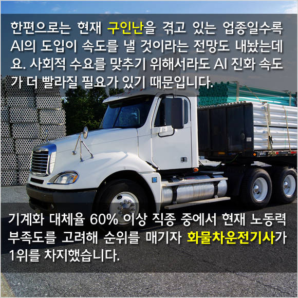 한편으로는 현재 구인난을 겪는 업종일수록 AI의 도입이 속도를 낼 것이라는 전망도 내놨는데요. 사회적 수요를 맞추기 위해서라도 AI 진화 속도가 더 빨라질 필요가 있기 때문입니다.