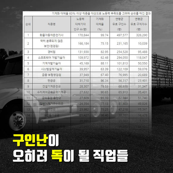 기계화 대체율 60% 이상 직종 중에서 현재 노동력 부족도를 고려해 순위를 매기자 화물차운전기사가 1위였습니다. 이밖에 △보안점검원 △경비원 △소프트웨어 개발자 △기계개발기술자 △금융·보험영업원 등도 기계 대체 가능성이 높은 직업 상위에 올랐네요.