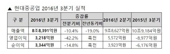 [프라임경제] 현대중공업(009540)은 3분기 매출 8조8391억원, 영업이익 3218억원(연결기준)을 기록했다고 26일 밝혔다.