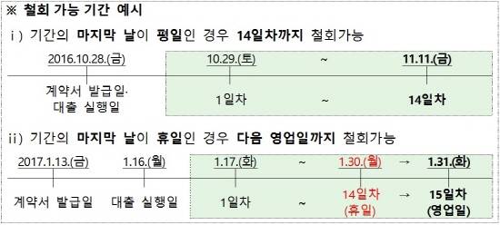 대출계약 철회권은 4000만원 이하의 신용대출과 2억원 이하의 담보대출을 이용하는 개인 대출자가 대상이며, 대출계약 후 2주 이내에 은행 영업점에 방문해 대출 원리금과 부대비용만 상환하면 된다.
