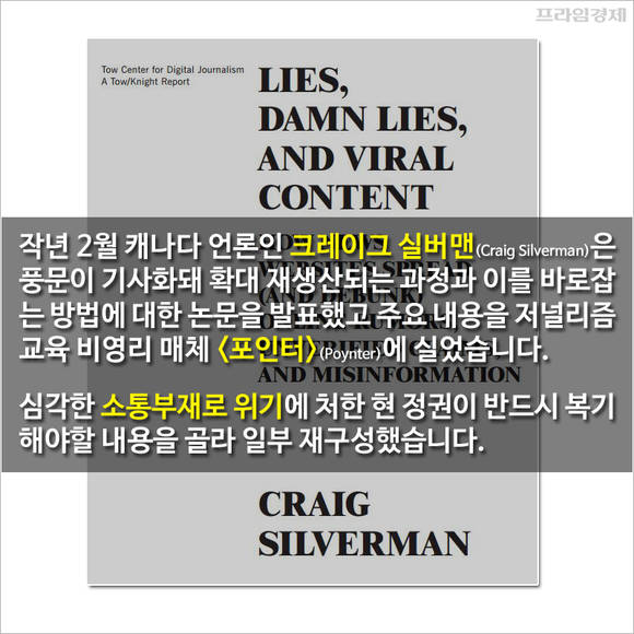 지난해 2월 캐나다 언론인 크레이그 실버맨(Craig Silverman)은 확인되지 않은 풍문이 고스란히 기사화돼 확대 재생산되는 과정과 이를 바로잡는 방법에 대한 논문을 발표했고 주요 내용을 저널리즘 교육을 위한 비영리 매체 <포인터>(Poynter)에 실었다.