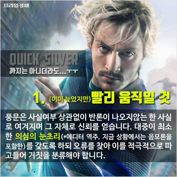 삽시간에 퍼져서 기정사실이 되는 소문의 공통점은 대부분 한 문장, 또는 단어 하나로 개연성이 완성된다는 것이다. 단순할수록 사람들 뇌리에 잘 박히기 때문이다. 풍문을 뒤집으려 하나하나 논리적으로 접근하다보면 힘만 빠질 가능성이 크다. 정정·반론의 생명은 간단하게 핵심을 저격하는 것이다.