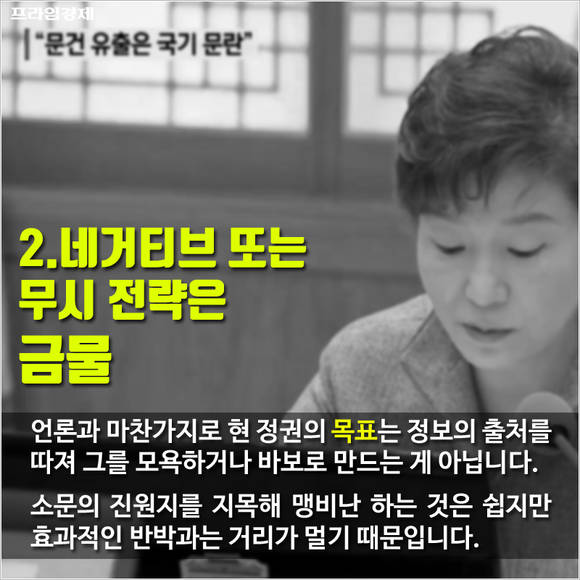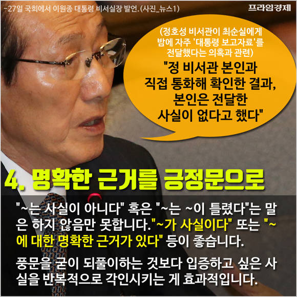 "~는 사실이 아니다" 혹은 "~는 ~이 틀렸다"는 말은 하지 않음만 못하다. "~가 사실이다" 또는 "~에 대한 명확한 근거가 있다" 등이 좋은 표현이다. 풍문을 굳이 되풀이해 시선을 끄는 것보다 입증하고 싶은 사실을 반복적으로 각인시키는 게 중요하다.
