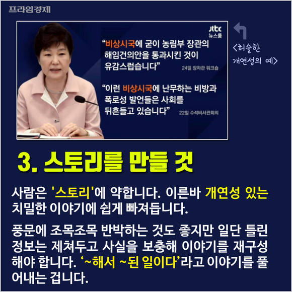 사람은 '스토리'에 약하다. 이른바 개연성 있는, 서사구조가 치밀한 이야기에 쉽게 빠져든다. 풍문에 대해 조목조목 반박하는 것도 좋지만 일단 틀린 정보는 제쳐두고 사실을 보충해 이야기를 재구성해야 한다. 해명은 ‘~해서 ~된 일이다’라고 개연성을 세워야 더 효과적으로 전달된다.