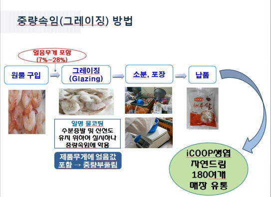 이씨는 2013년 1월부터 10년간 냉동새우살 등 5종을 물코팅(일명 글레이징) 방법으로 중량을 속여 iCOOP매장에 납품해 6억3000만원 상당의 부당이득을 취했다.