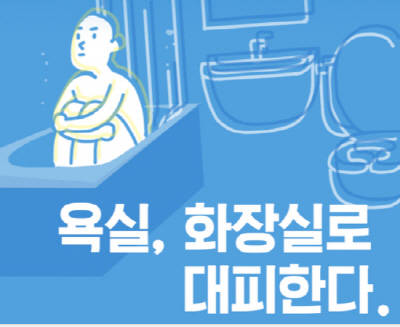 △밖으로 나가기 어려운 경우라면 - 욕실이나 화장실로 피해야 해요. 욕실은 '콘크리트'라는 건물 재료를 두껍게 쌓고 '철근'이라는 건물재료를 많이 사용해서 만든대요. 그래서 욕실이 안전하다고 해요. 또 물이 있으니까 혼자 남겨졌을 경우에 물을 마실 수 있어요.