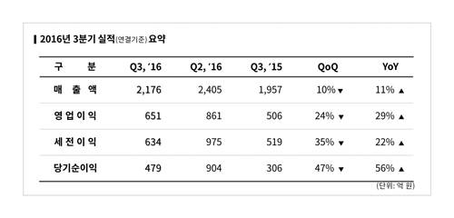 전년 동기대비 매출과 영업이익은 각각 11%, 29% 상승했고, 당기순이익은 56% 증가했지만 전분기 대비 매출은 10%, 영업이익과 당기순이익은 각각 24%, 47% 감소한 것으로 조사됐다.