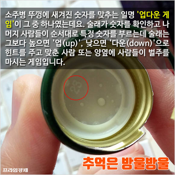 소주병 뚜껑에 새겨진 숫자를 맞추는 일명 '업다운 게임'이 그중 하나였는데요. 술래가 숫자를 확인하고 나머지 사람들이 순서대로 특정 숫자를 부르는데 술래는 그보다 높으면 '업(up)', 낮으면 '다운(down)'으로 힌트를 주고 맞춘 사람 또는 양옆에 사람들이 벌주를 마시는 게임입니다.