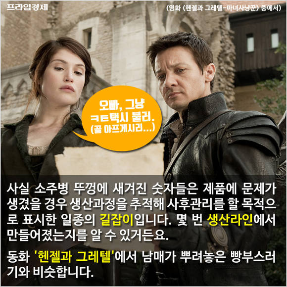 사실 소주병 뚜껑에 새겨진 숫자들은 제품에 문제가 생겼을 경우 생산과정을 추적해 사후관리를 할 목적으로 표시한 일종의 길잡이입니다. 몇 번 생산라인에서 만들어졌는지를 알 수 있거든요. 동화 '헨젤과 그레텔'에서 남매가 뿌려놓은 빵부스러기와 비슷합니다.