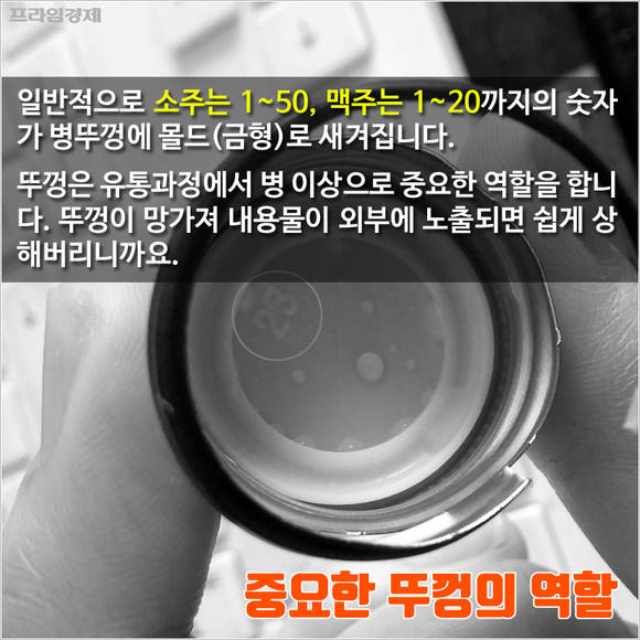 일반적으로 소주는 1~50, 맥주는 1~20까지의 숫자가 병뚜껑에 몰드(금형)로 새겨집니다. 뚜껑은 유통과정에서 주류를 관리하는 과정에서 병 이상으로 중요한 역할을 합니다. 뚜껑이 망가져 내용물이 외부에 노출되면 쉽게 상해버리니까요.