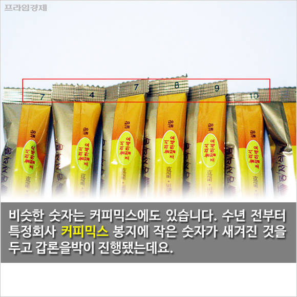 비슷한 숫자는 커피믹스에도 있습니다. 수년 전부터 특정회사 커피믹스 봉지에 작은 숫자가 새겨진 것을 두고 갑론을박이 진행됐는데요.