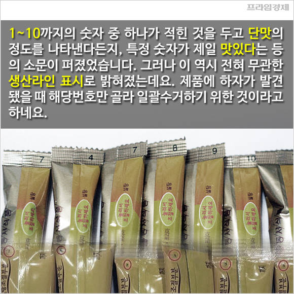 1~10까지의 숫자 중 하나가 적힌 것을 두고 단맛의 정도를 나타낸다든지, 특정 숫자가 제일 맛있다는 등의 소문이 퍼졌었습니다. 그러나 이 역시 맛과는 전혀 무관한 생산라인 표시로 밝혀졌는데요. 제품에 하자가 발견됐을 때 해당번호만 골라 일괄수거하기 위한 것이라고 하네요.