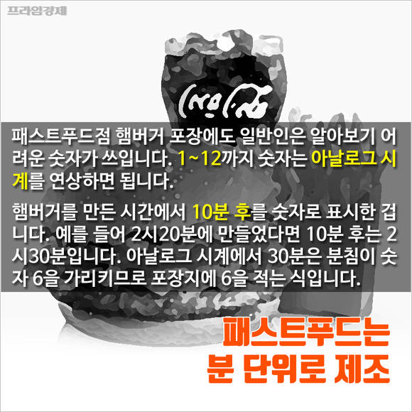 패스트푸드점의 햄버거 포장에도 일반인은 알아보기 어려운 숫자가 쓰입니다. 1~12까지의 숫자가 적히는데요. 이는 아날로그 시계를 연상하면 됩니다. 햄버거를 만든 시간에서 10분 후를 숫자로 표시한 것이죠. 예를 들어 2시20분에 만들었다면 10분 후는 2시30분입니다. 아날로그 시계에서 30분은 분침이 숫자 6을 가리키죠. 그럼 포장지에 6을 적는 식입니다.