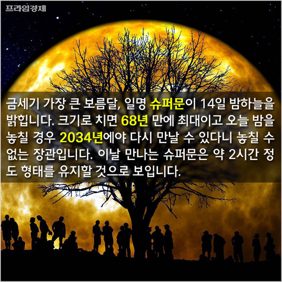 [프라임경제] 금세기 가장 큰 보름달, 일명 슈퍼문이 14일 밤하늘을 밝힌다. 크기로 치면 68년 만에 최대이고 오늘 밤을 놓칠 경우 2034년에야 다시 볼 수 있어 놓칠 수 없는 장관이 될 전망이다.