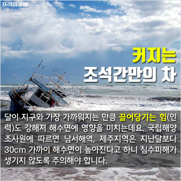 달이 지구와 가장 가까워지는 만큼 끌어당기는 힘(인력)도 강해진다. 국립해양조사원에 따르면 남서해역, 제주지역의 경우 지난달보다 30㎝ 가까이 해수면이 높아질 것으로 보여 침수피해에 대피할 필요가 있다.