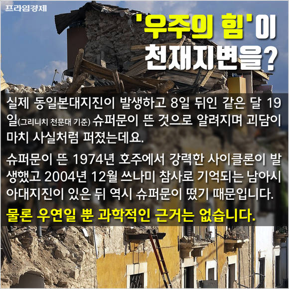 실제 동일본대지진이 발생하고 8일 뒤인 같은 달 19일(그리니치 천문대 기준) 슈퍼문이 뜬 것으로 알려졌고 1974년 호주에서 발생한 강력한 사이클론과 2004년 12월 남아시아대지진 전후에도 슈퍼문이 떴다는 말이 돌면서 유명세를 탄 바 있다.