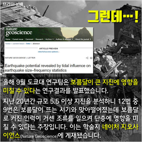 이에 따르면 지난 20년간 규모 5.5 이상 지진을 분석해보니 12번 중 9번은 보름달이 뜨는 시기와 맞아떨어졌다. 보름달로 인해 커진 인력이 거센 조류를 일으키고 단층에 영향을 미칠 수 있다는 주장이다. 이 같은 내용은 최근 '네이처 지오사이언스'(Nature Geoscience)에 게재됐다.
