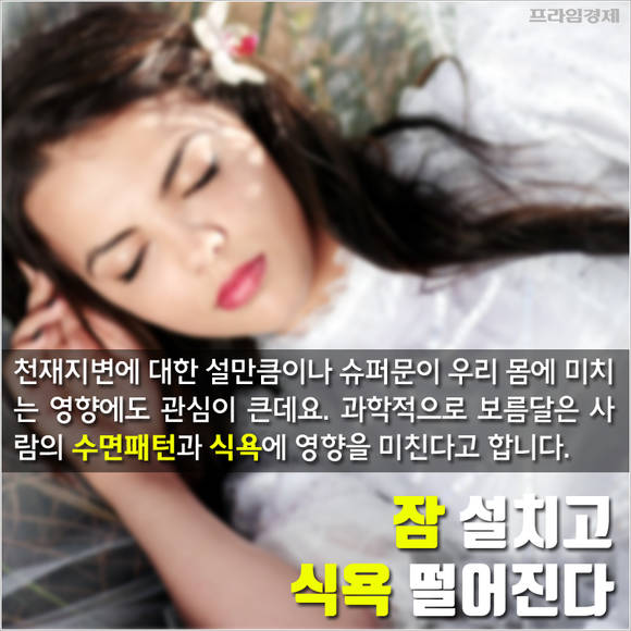 또한 슈퍼문이 우리 몸에 미치는 영향에도 관심이 크다. 과학적으로 보름달은 사람의 수면패턴과 식욕에 영향을 미치는 것으로 알려졌다.