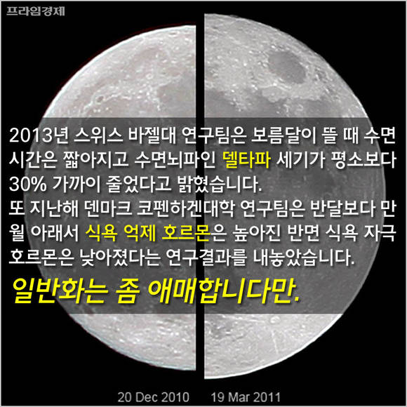 2013년 스위스 바젤대 연구팀에 따르면 보름달이 뜰 때 수면시간은 짧아지고 수면 뇌파인 델타파 세기가 평소보다 30% 가까이 줄었다. 지난해 덴마크 코펜하겐대학 연구팀은 보름달이 뜨면 발달 때에 비해 식욕 억제 호르몬은 높아지고 식욕 자극 호르몬은 낮아진다고 밝힌 바 있다.