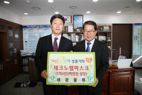 해광물류는 모가면 소재 편의점 유통업체로 최근에는 계절을 가리지 않고 찾아오는 황사와 미세먼지 방지에 탁월한 테크노웹마스크 7만4000매(1억4300만원 상당)을 기탁했으며, 이는 푸드뱅크와 푸드마켓을 통해 저소득층에게 전달될 예정이다.