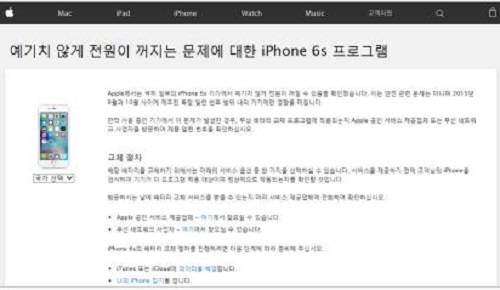 애플은 '예기치 않게 전원이 꺼지는 문제에 대한 아이폰6s 프로그램'이란 제목의 공지를 20일 게재하면서 중국을 제외한 주요 비영어권 국가에 영문으로만 했다. 여기에는 배터리 교체 대상과 절차 등이 담겨있다.