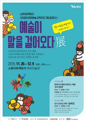 광산구가 주최하고 소촌아트팩토리가 주관하는 '예술이 말을 걸어오다 展'이 '누구나 예술가가 될 수 있다'를 주제로 26일부터 다음 달 9일까지 소촌아트팩토리 큐브미술관에서 개최한다.