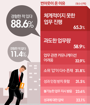 그렇다면 번아웃이 오는 이유는 무엇일까. 이에 대해 복수응답으로 알아본 결과, '체계적이지 못한 업무 진행'이 65.3%로 가장 많았고 이어 △과도한 업무량 58.9% △업무 관련 커뮤니케이션 어려움 32.9% △소위 '갑'이 다수 존재 31.8% △성과 인정받지 못함 31.5% △불가능한 업무 지시 받음 23.6% △성과에 대한 압박 22.1% 등이 있었다.
