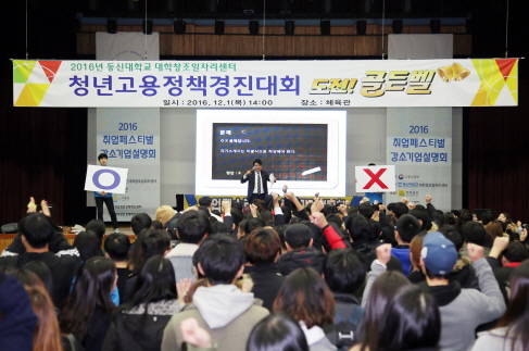 오후에 진행된 도전골든벨 코너는 300여명의 학생들이 몰리며 호응이 뜨거웠다. 국가직무능력표준(NCS)기반 능력중심 채용, 해외취업, 정부 청년고용사업, 동신대학교 창조일자리센터 등과 관련한 O,X 퀴즈를 통해 최종 30명을 선정하고, 선정된 30인을 대상으로 주관식 문제를 출제하여 1등부터 27등 참가자에게 상장과 상금을 수여했다.
