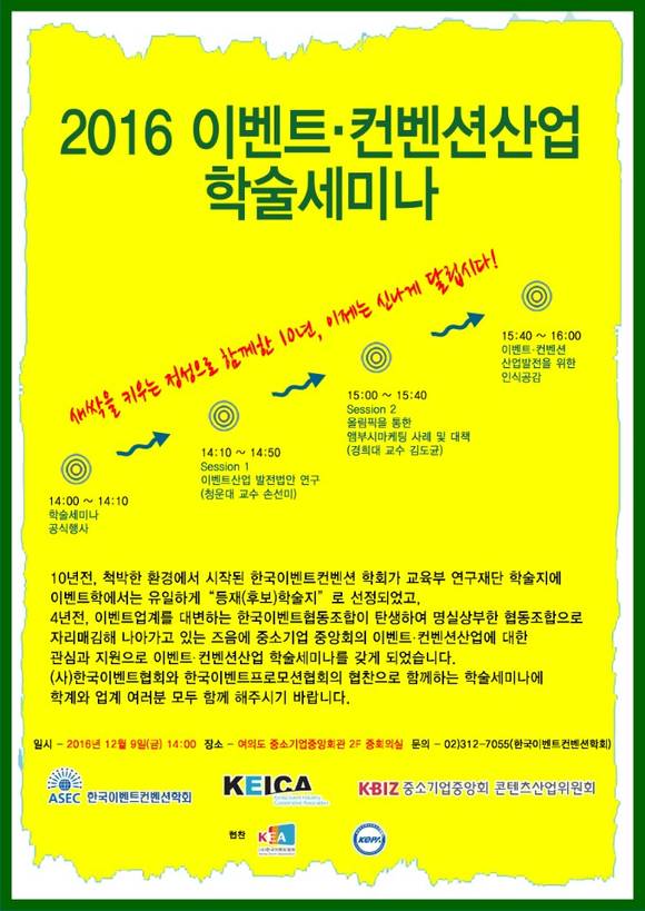 업계의 숙원사업인 이벤트산업진흥법(가칭) 발의를 위한 용역을 수행한 손선미 청운대학교 교수의 '이벤트산업 발전법안 연구'가 진행된다. 김도균 경희대학교 교수의 '리우 올림픽의 엠부시마케팅' 주제 발표도 마련된다.