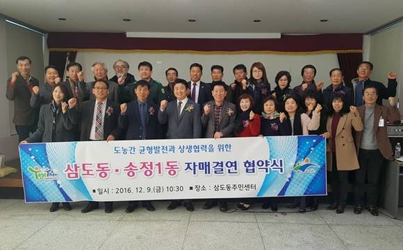 이날 협약식에서 송정1동 강광민, 삼도동 송영종 주민자치위원장은 마을 특성을 살린 도농 교류와 주민들의 문화·경제교류에 나서기로 했다. 이와 함께 직거래 장터를 열고, 자매동 행사에 적극 참여해 소통과 화합을 도모할 것도 약속했다.