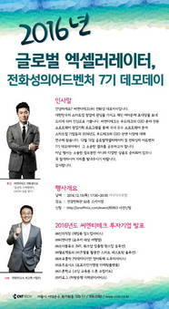 [프라임경제] 씨엔티테크(대표 전화성)는 이달 15일 오후 5시 여의도 전경련회관 50층 스카이팜에서 '2016년 글로벌 엑셀러레이터, 전화성의 어드벤처 7기 데모데이'를 개최한다고 밝혔다.