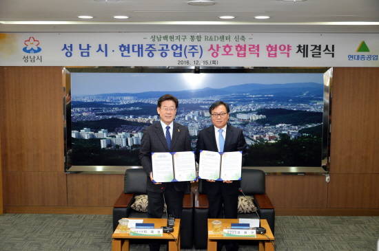 성남시는 15일 오전11시 시청 9층 상황실에서 이재명 성남시장과 강환구 현대중공업㈜ 대표이사 등이 참석한 가운데 '성남 백현지구 내 통합 R&D센터 신축'에 관한 업무 협약을 체결했다.