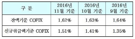 잔액 기준 코픽스 금리는 연 1.62%로 지난달에 비해 0.01%포인트 떨어졌다. 과거 취급한 고금리 예금의 만기가 도래하고 상대적으로 저금리인 신규 예금이 반영되면서 하락세가 지속되고 있다. 잔액기준 코픽스는 2010년 2월 코픽스 도입 이래 최저치이며 59개월째 하락하고 있다.