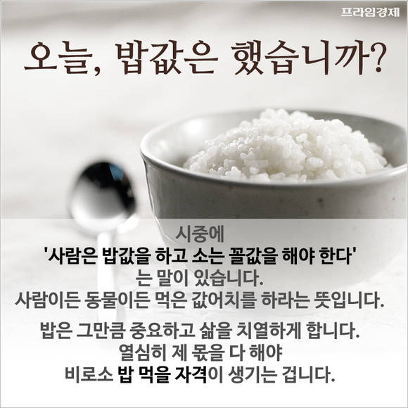 [프라임경제] 시중에 '사람은 밥값을 하고 소는 꼴값을 해야 한다'는 말이 있다. 사람이든 동물이든 먹은 만큼 값어치를 해야 한다는 뜻이다. 밥은 그만큼 중요하고 삶을 치열하게 한다. 열심히 제 몫을 다 하는 사람만이 비로소 밥 먹을 자격이 생긴다.