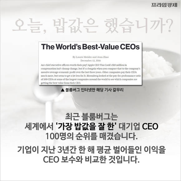 지난 13일 블룸버그는 세계에서 '가장 밥값을 잘 한' 대기업 CEO 100명의 순위를 매겼다. 기업이 지난 3년간 한 해 평균 벌어들인 이익을 CEO 보수와 비교한 것.