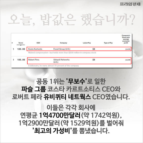 1위는 무보수로 일한 파슬 그룹의 코스타 카르트소티스 CEO와 로버트 페라 유비퀴티 네트웍스 CEO였다. 이들은 각각 회사에 연평균 1억4700만달러(약 1742억원), 1억2900만달러(약 1529억원)를 벌어줘 '최고의 가성비'를 뽐냈다.