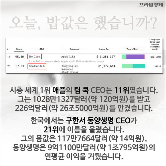 시가총액 세계 1위 애플의 팀 쿡 CEO도 11위에 올라 상위권을 차지했다. 그는 1028만1327달러(약 120억원)를 받고 회사에 226억달러(약 26조5000억원)를 안겼다. 한국에서도 구한서 동양생명 CEO가 21위에 이름을 올렸다. 그의 몸값은 117만7664달러(약 14억원)였지만 회사는 9억1100만달러(약 1조795억원)의 이익을 냈다.