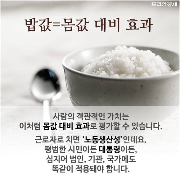 사람의 객관적인 가치는 이렇게 몸값 대비 효과로 평가받는다. 노동시장에서는 이를 '노동생산성'이라 부르며 그가 평범한 시민이든 대통령이든 상관없이 적용 가능한 논리다.