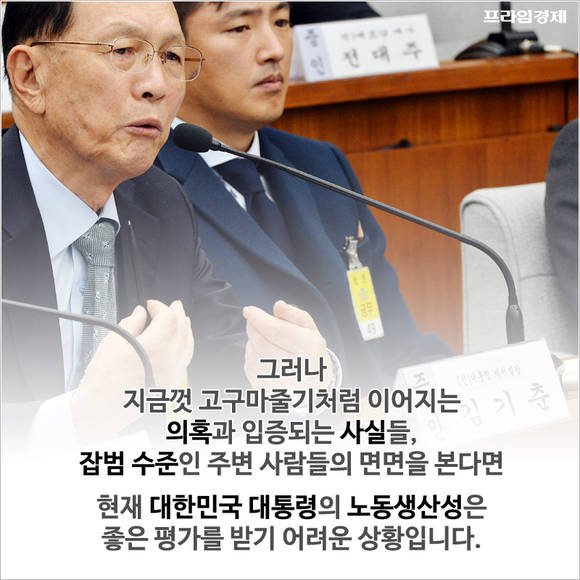 그러나 고구마줄기처럼 이어지는 의혹과 입증되는 사실들, 그리고 잡범 수준에 불과한 주변 사람들의 면면은 현재 대한민국 대통령의 '노동생산성'에 대해 좋은 평가를 내리기 어렵게 한다.