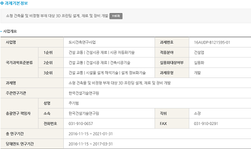 21일 한국건설기술연구원(이하 건기연) 등에 따르면 건기연은 국토교통부 도시건축연구사업의 일환으로 지난달 15일 3D프린팅을 활용한 건축사업에 착수했다.